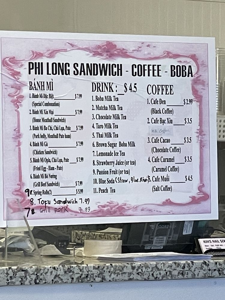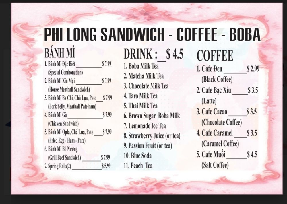 Welcome to Phi Long, a hidden gem located at 4605 Geary Blvd, San Francisco. This charming Vietnamese eatery offers a delightful menu that revolves around authentic Banh Mi, bubble tea, and artisanal coffee. Each sandwich features fresh ingredients and perfectly toasted baguettes, with crowd favorites like the Banh Mi Dac Biet and Banh Mi Ga tantalizing the taste buds. Guests rave about the unique flavors and the friendly service from the attentive staff.
